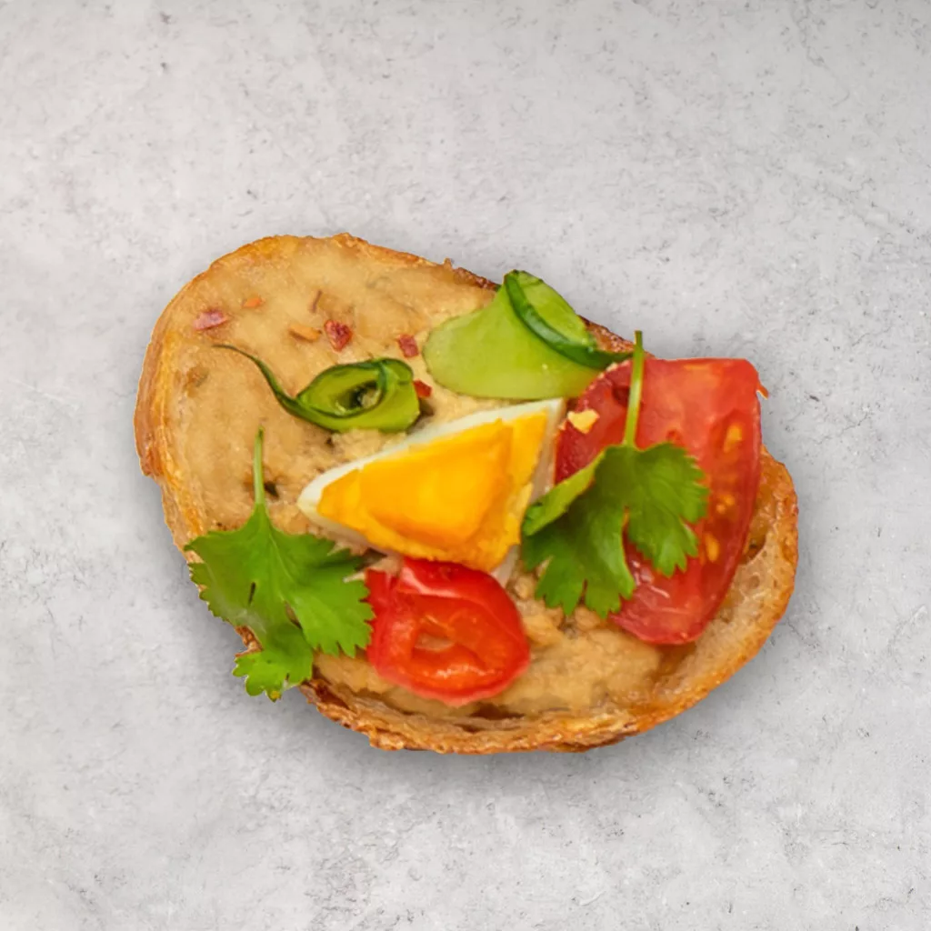 Készülj fel egy apró, de robbanó ízbomba utazásra! A lágy tojáskrém találkozik a gazdag, enyhén fűszeres indonéz mogyorókrémmel, melyet gyakran egy csipet chili, szójaszósz és kókusztej tesz még különlegesebbé. Ez a textúrák és ízek egyedi keveréke egy falatnyi ropogós kenyér alapon nyugszik, melyet friss korianderrel vagy aprított mogyoróval díszítünk. Édes, sós, pikáns és krémes – minden benne van, ami egy különleges falatkát ellenállhatatlanná tesz. Tökéletes választás azoknak, akik szeretik a merész, új ízeket felfedezni.