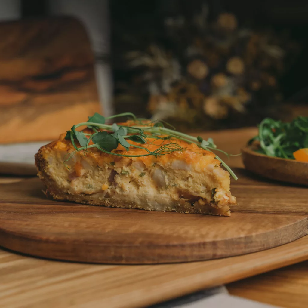 Házias sonkás-hagymás quiche gazdag gouda sajttal és tejszínes töltelékkel, ropogós, teljes kiőrlésű tésztaágyon. Egy igazi francia klasszikus, amely melegen és hidegen is tökéletes gourmet kényeztetés.