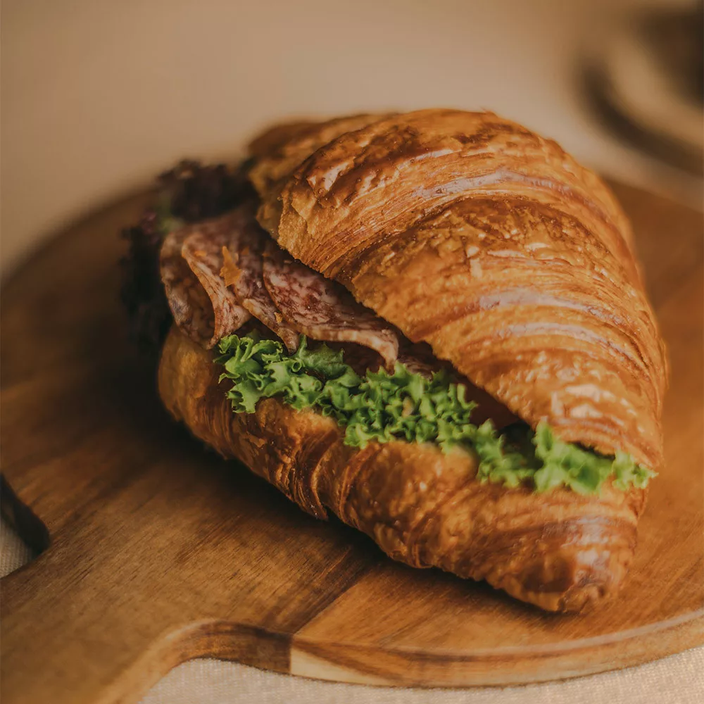 A ropogós, vajas croissant tökéletes keretet ad ennek a gazdag ízkombinációnak. Belül a vékonyra szeletelt, fűszeres szalámi és a lyukacsos, enyhén édesképes ementáli sajt találkozik. A sajt jellegzetes, diós íze és a szalámi pikantériája fantasztikus párost alkot a croissant lágy, vajas textúrájával. Néha egy pici mustár vagy friss salátalevél is kerül bele, ami még izgalmasabbá teszi az ízeket. Ideális választás egy laktató reggelihez, vagy egy kiadós uzsonnához.
