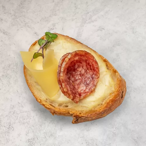 Ez a falatnyi canapé a magyaros ízek ikonikus képviselője! A ropogós mini kenyérre egy vékony réteg vaj vagy krémsajt kerül, melyre aztán a karakteres ízű, fűszeres téliszalámi vékony szeletei kerülnek. Gyakran friss paprika karikákkal, uborkával vagy petrezselyemmel díszítik, ami nemcsak a látványt teszi vonzóbbá, de az ízeket is frissíti. Tökéletes választás gyors falatnak, vendégvárónak, vagy büféasztalra, ahol a hagyományos, de mégis különleges ízek a cél.