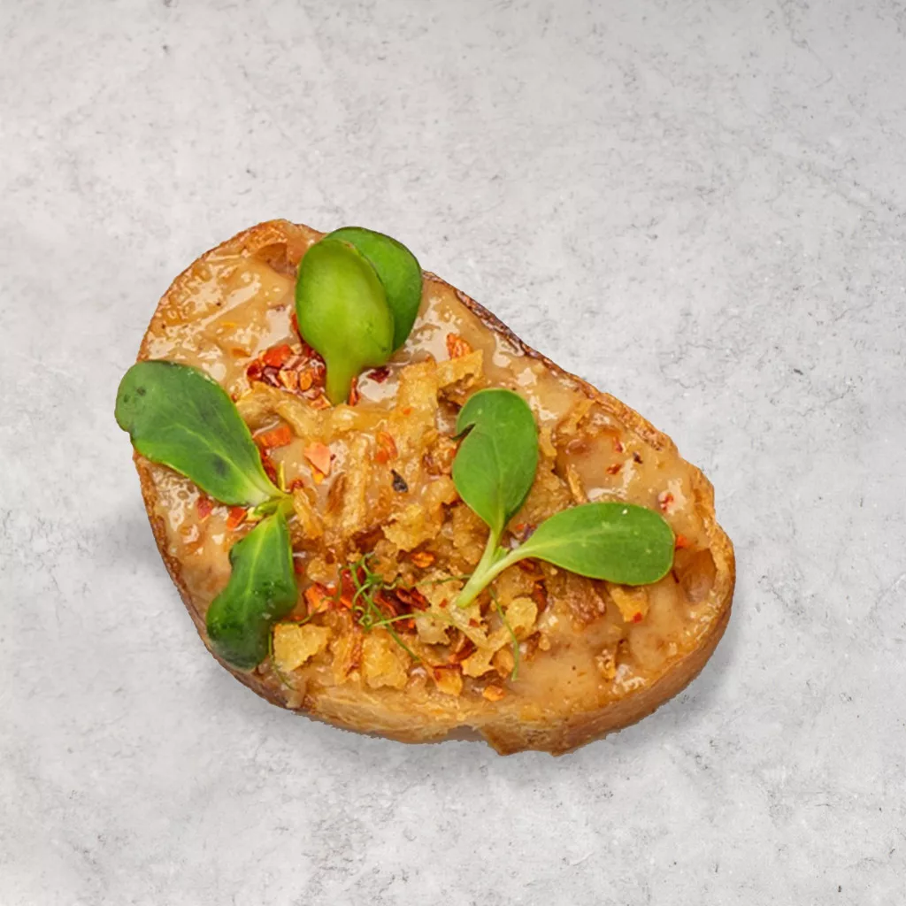 Ez a falatnyi canapé a régmúlt idők ízeit hozza vissza, modern köntösben! A ropogós mini kenyérre bőségesen kerül a házi készítésű, gazdag és fűszeres tepertőkrém, melyet apróra vágott lilahagyma, friss paprika és egy csipet só tesz még ellenállhatatlanabbá. A tepertő jellegzetes íze és a krémes textúra tökéletes harmóniában van a friss kenyérrel. Kiváló választás vendégvárásra, borozás mellé, vagy egy kiadós, mégis elegáns falatnak.
